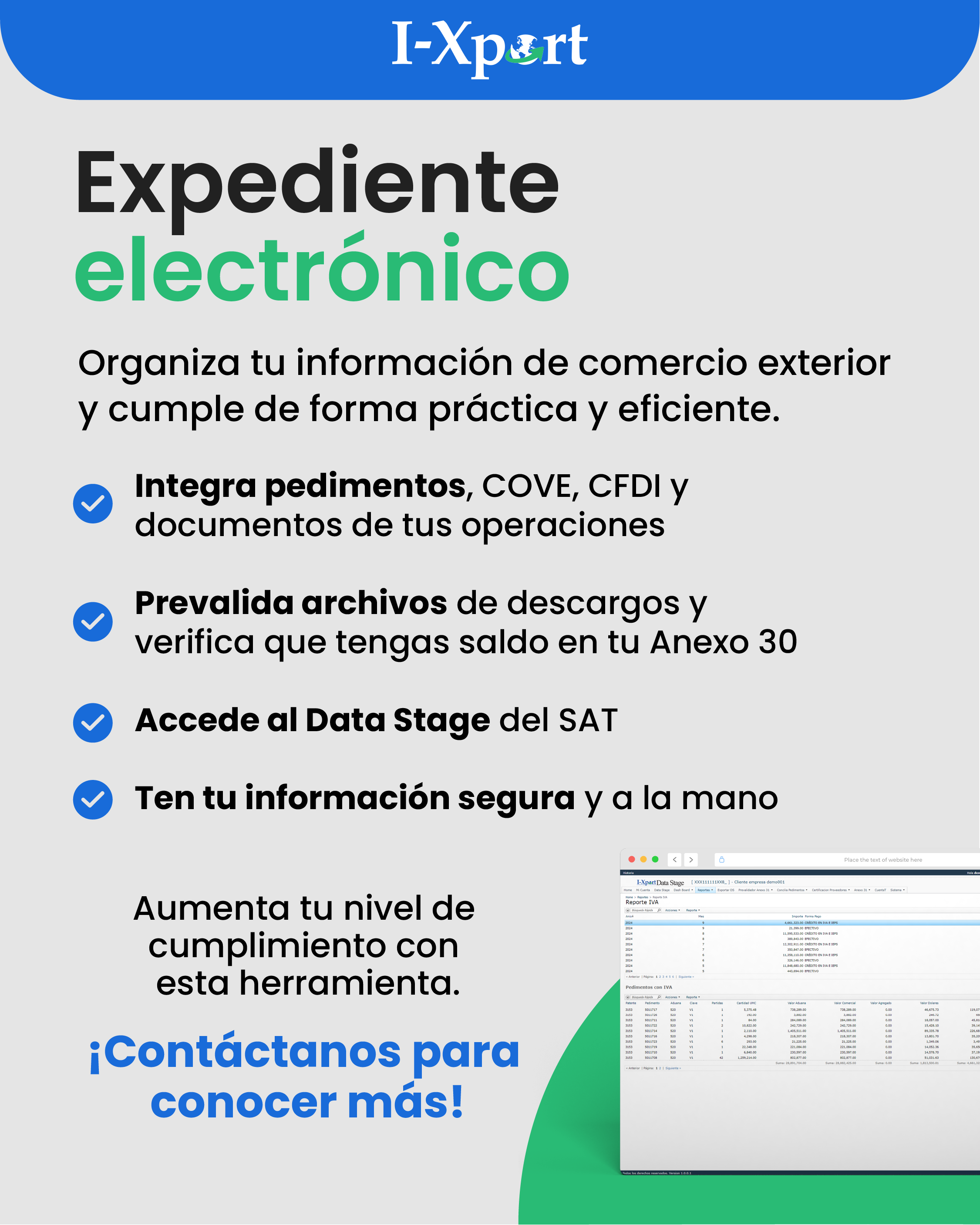Para facilitar ese control, I-Xport cuenta con una solución de Expediente Electrónico que, además de integrar y resguardar tu información de forma segura en la nube, te permite acceder a la información de tus pedimentos en Data Stage 48 horas después de haber sido pagados. De esta forma puedes detectar y atender discrepancias para evitar multas.