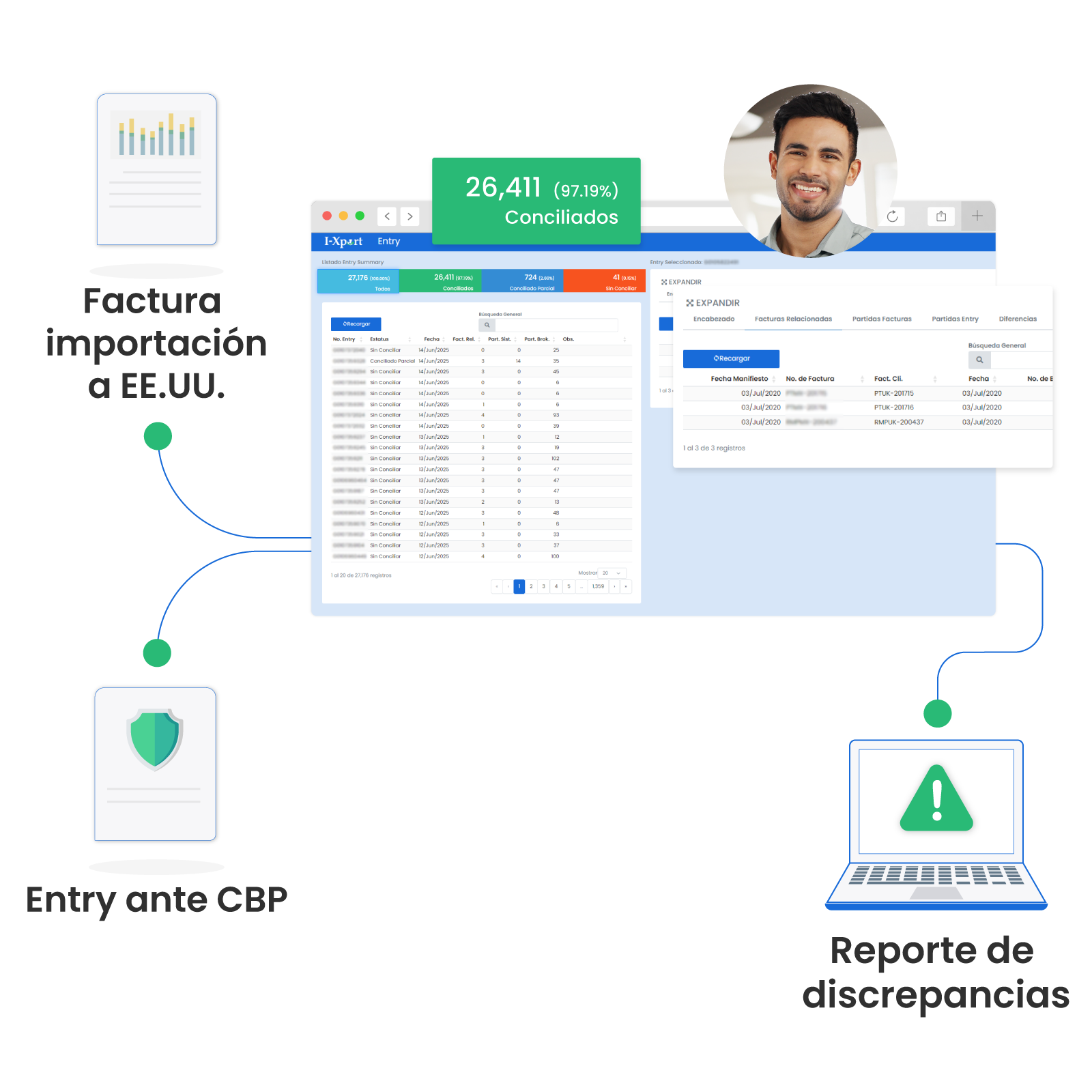 Conciliador de Entry es un sistema en la web que automatiza la verificación entre tus facturas de importación hacia EE. UU. y los datos presentados en los Entry ante el CBP.